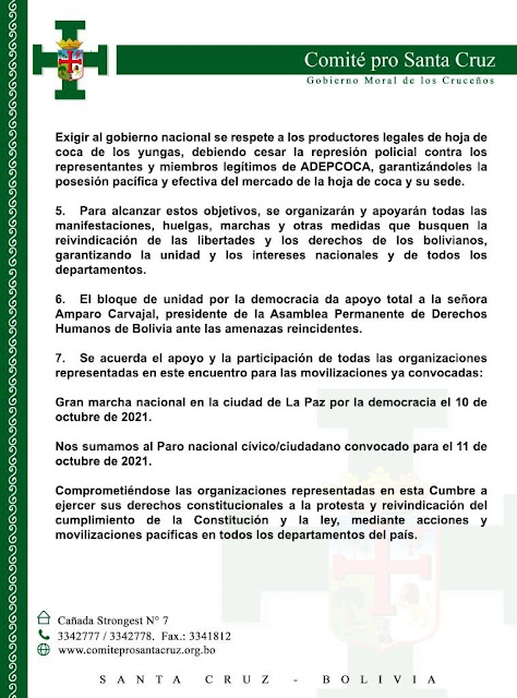 En el punto número 7, del manifiesto público de esta cumbre, se decidió realizar una marcha nacional, en la ciudad de La Paz, el 10-10-21 y un paro nacional para el 11-10-2021, de 24 horas.